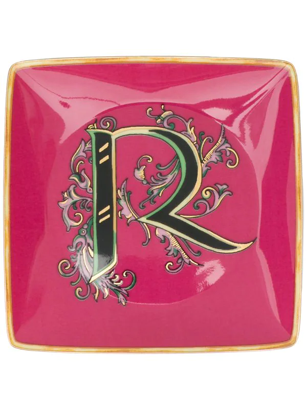 Cendrier à imprimé baroque Versace Home avec forme carrée, imprimé baroque et dessus concave. Couleur : rose.