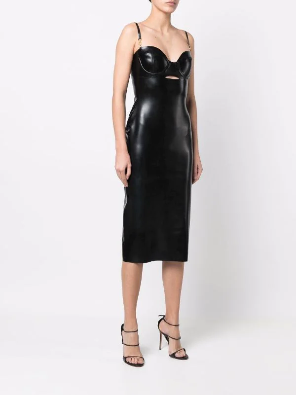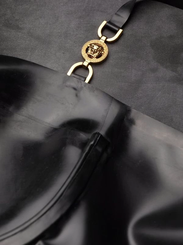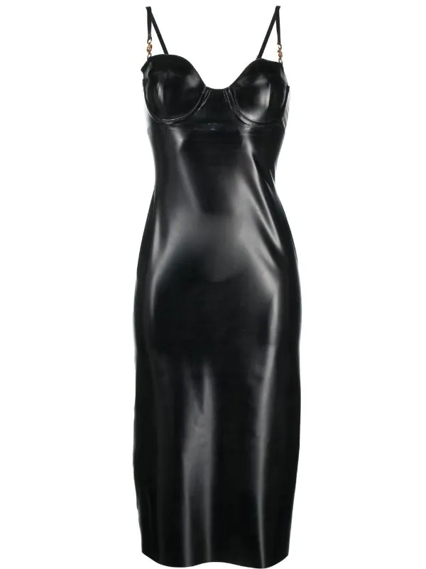Encolure style bustier, bretelles fines, détail Medusa, fermeture zippée à l’arrière, coupe mi-longue. Couleur : noir. Matière : latex. Veuillez noter que nous n’acceptons pas les retours pour les articles en latex.
