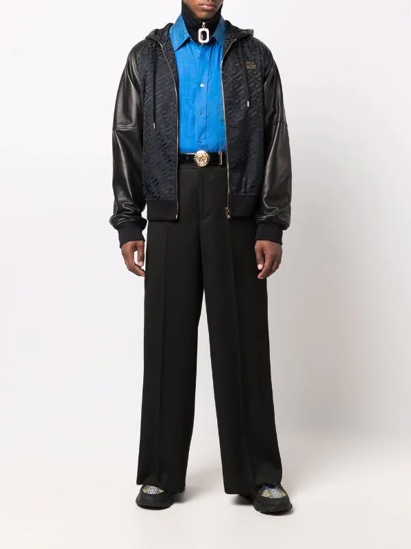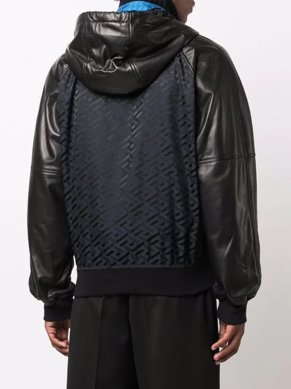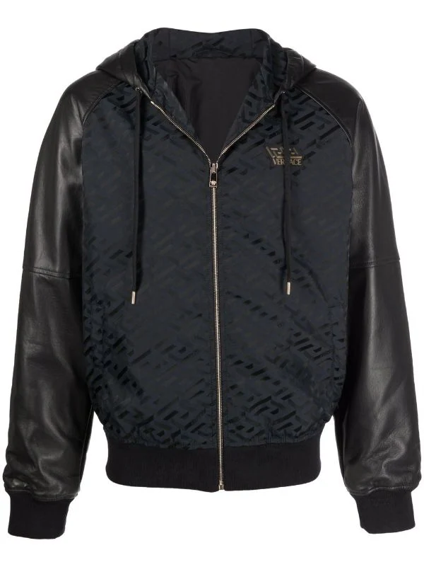 Capuche à lien de resserrage, fermeture zippée devant, manches longues, design à empiècements, patch poitrine à logo, motif Greca signature imprimé. Couleur : noir. Matière : peau d’agneau.