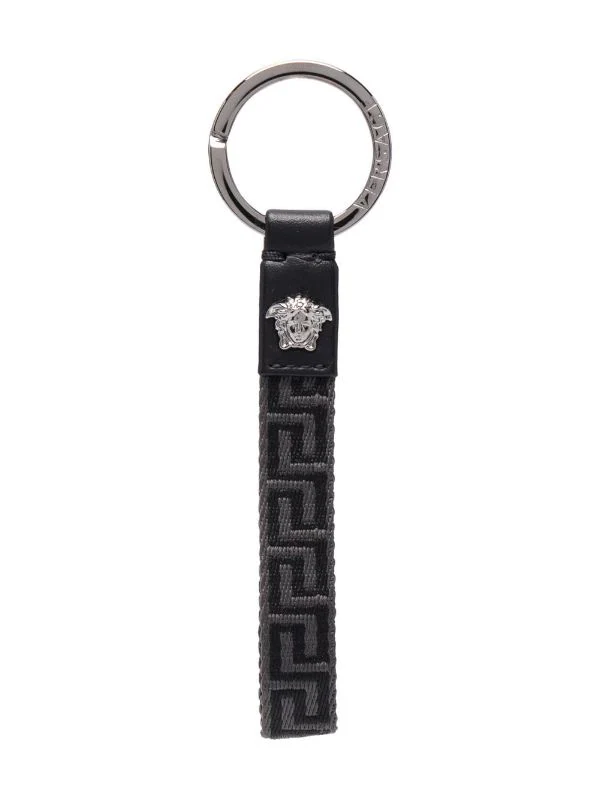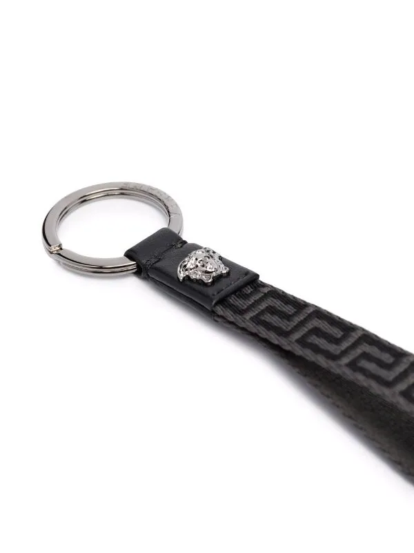 Motif Medusa, détail Greca signature, ornements argentés, anneau porte-clés. Matière : cuir.