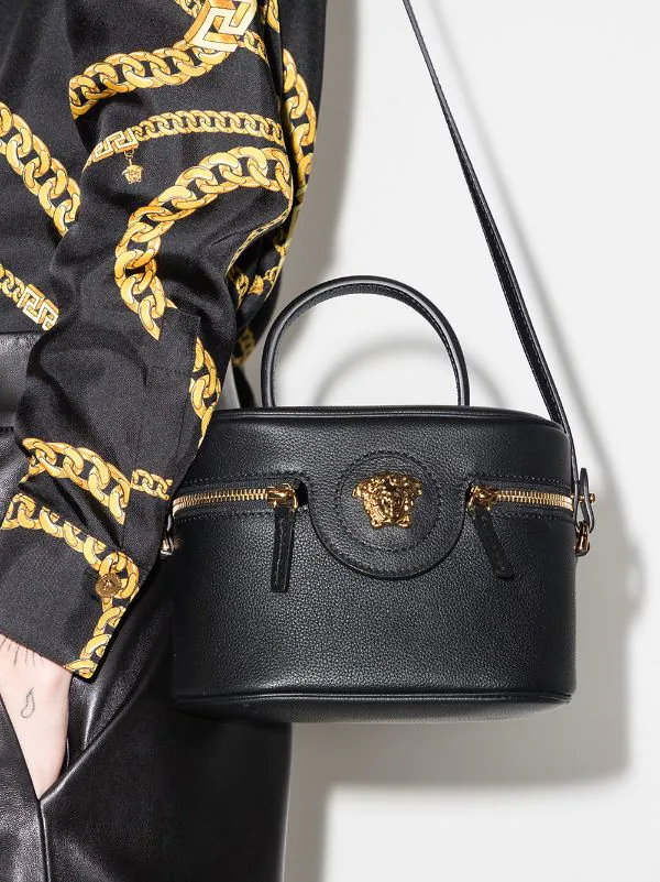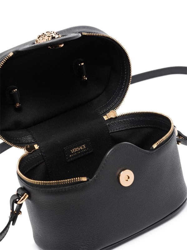 Motif Medusa, finitions en métal doré, bride porté épaule détachable et ajustable, anse arrondie, fermeture zippée tout autour, logo doré, patch logo intérieur. Couleur : noir. Matière : cuir.