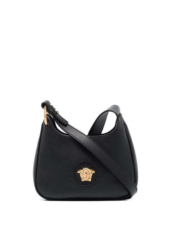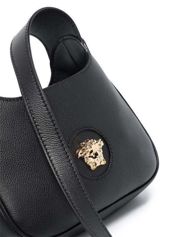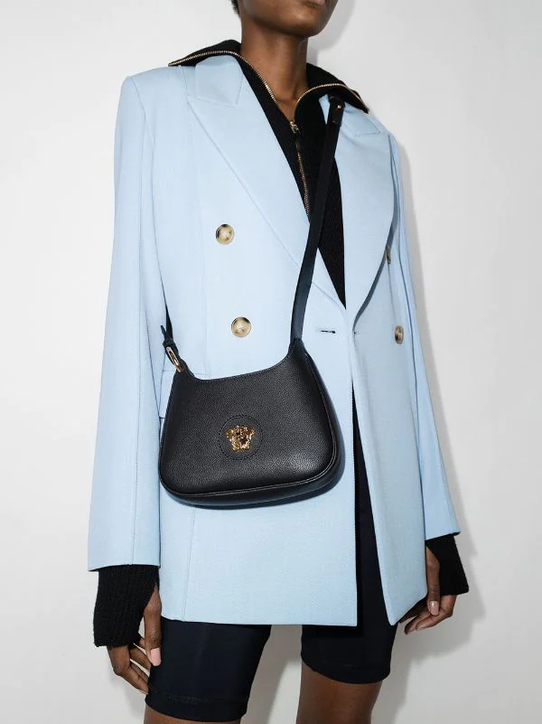 Détail Medusa, logo imprimé à l’arrière, finitions en métal doré, ouverture sur le dessus, bride porté épaule ajustable, compartiment principal, poche intérieure plaquée. Couleur : noir. Matière : cuir.