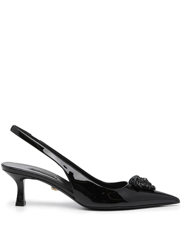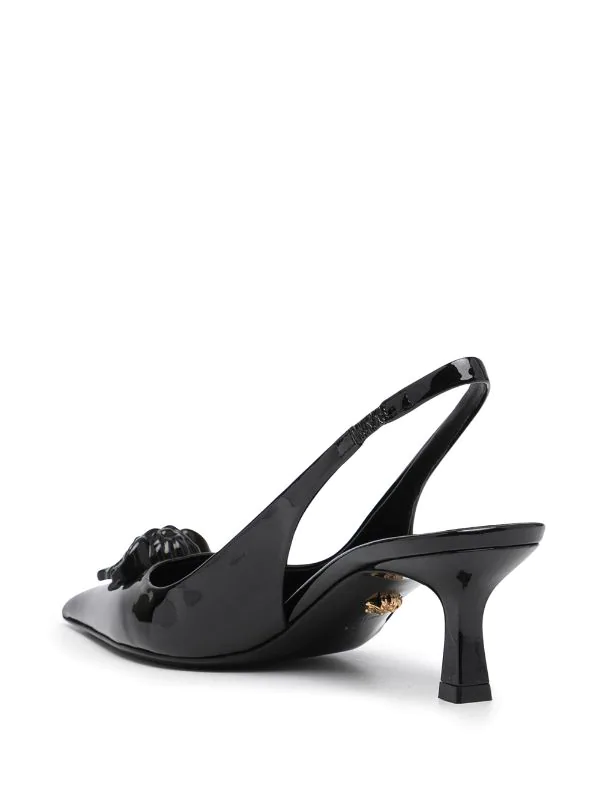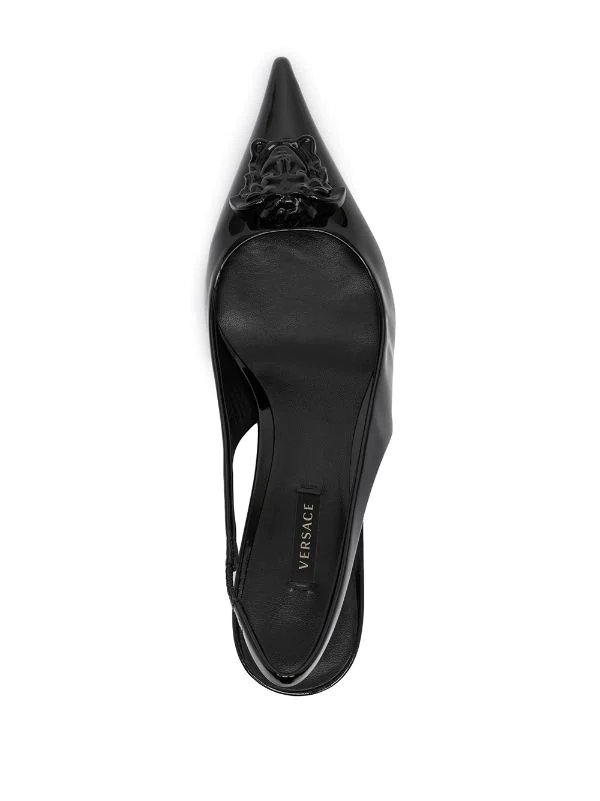 Détail Medusa, bout pointu, bride arrière à boucle, petit talon. Couleur : noir. Matière : cuir.