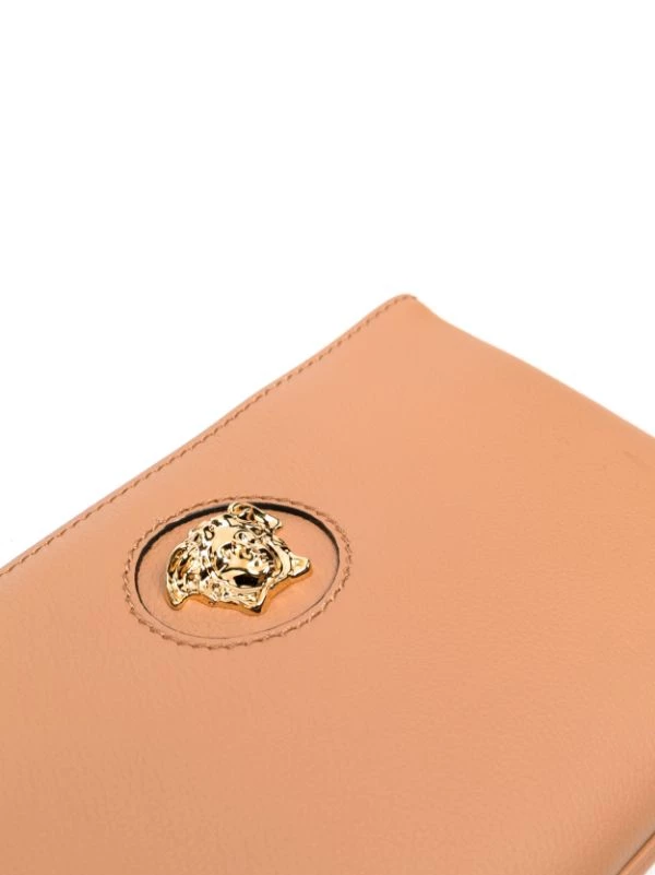 Motif Medusa, fermeture zippée sur le dessus, anse-dragonne détachable. Couleur : marron. Matière : cuir de veau.
