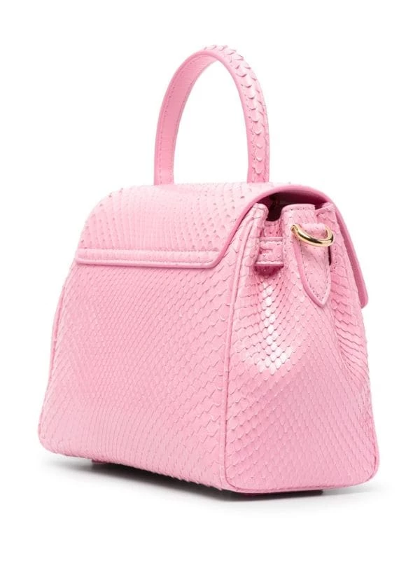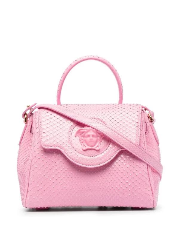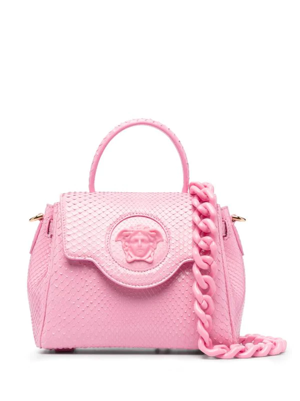 Effet peau de serpent, motif Medusa, anse arrondie, rabat sur le devant, bride porté épaule en chaîne détachable, bride porté épaule détachable et ajustable. Couleur : rose.