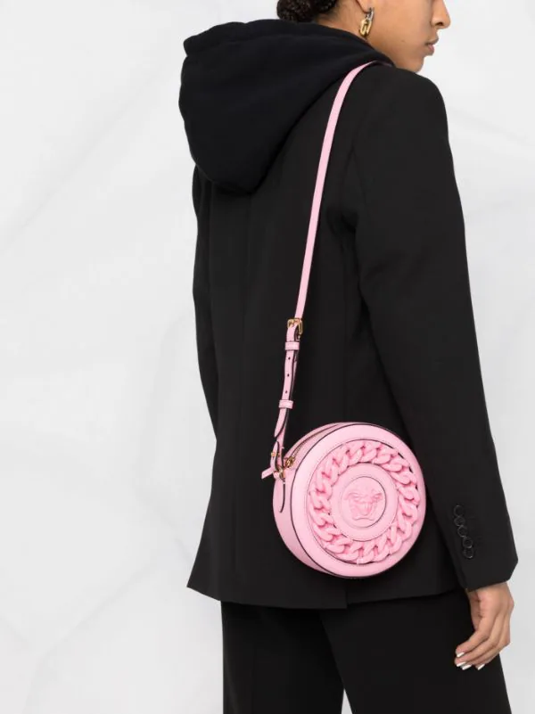 Motif Medusa, détail de chaîne oversize, fermeture zippée sur le dessus, compartiment principal, poche intérieure plaquée, bride porté épaule détachable et ajustable. Matière : cuir de veau.