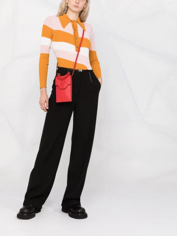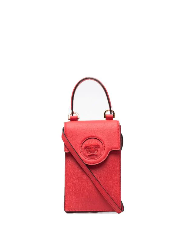 Motif Medusa, anse arrondie, bride porté autour du cou détachable, dessus à rabat avec bouton pression. Couleur : rouge. Matière : cuir.