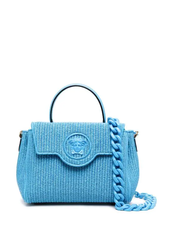 Design en raphia tressé, liseré en cuir, anse arrondie, motif Medusa, rabat sur le devant, compartiment principal, poche intérieure zippée, bride porté épaule en chaîne détachable, bride porté épaule détachable et ajustable. Couleur : bleu.