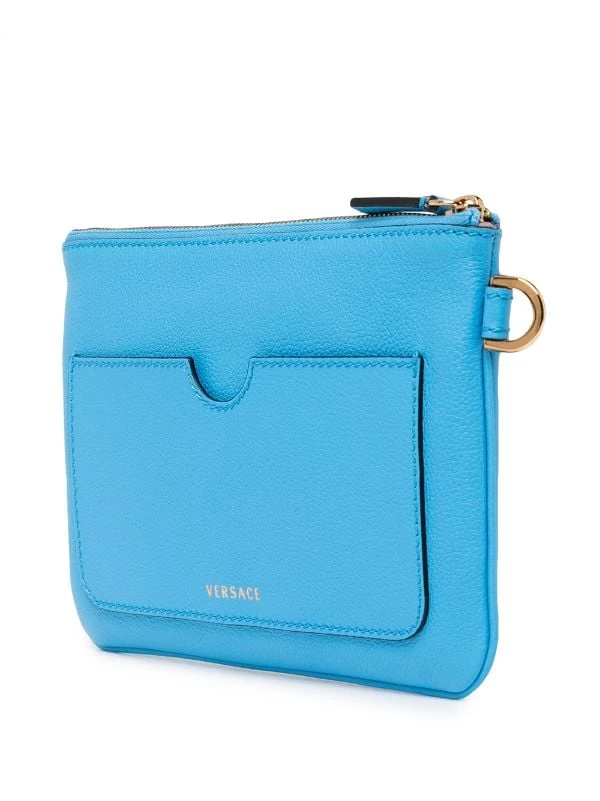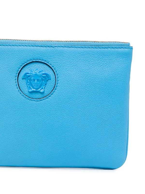 Motif Medusa, plaque logo ton sur ton, fermeture zippée sur le dessus, compartiments intérieurs pour carte, poche plaquée à l’arrière, compartiment principal, finitions en métal doré. Couleur : bleu. Matière : cuir.