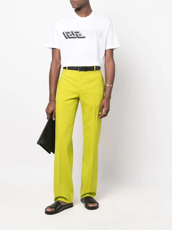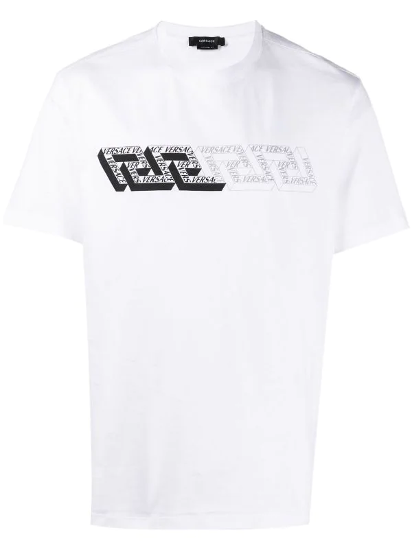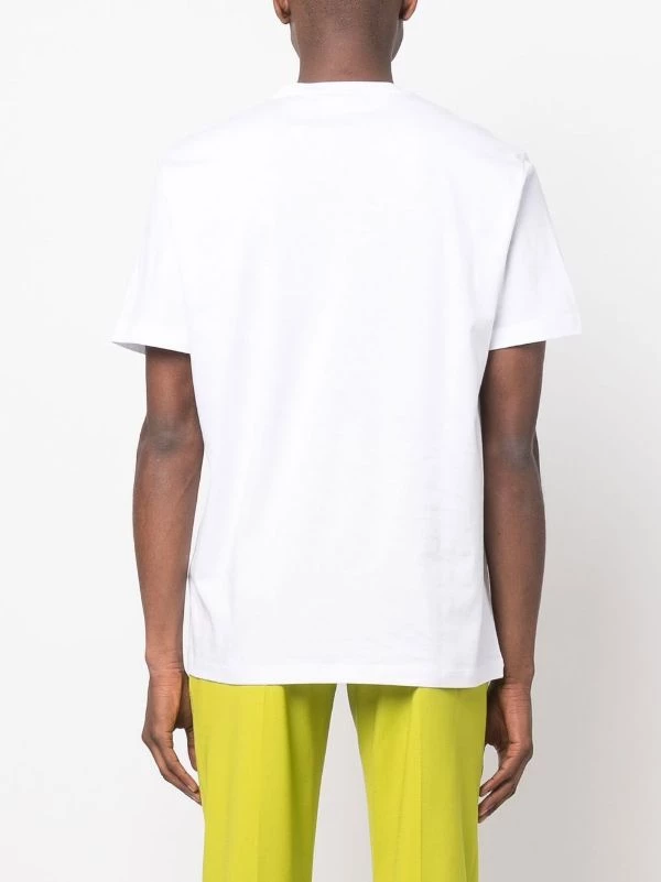 Blanc, coton, détail Greca signature, encolure ras du cou, manches courtes, ourlet droit.