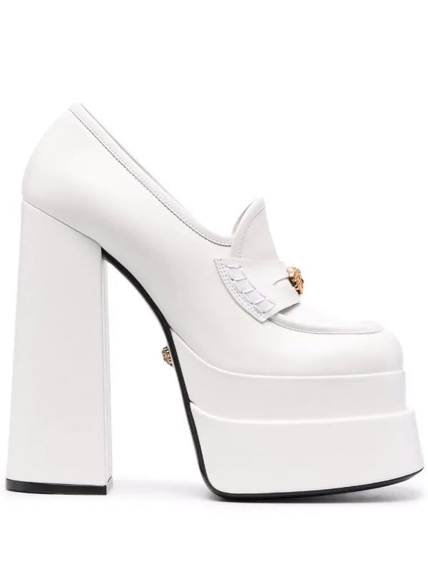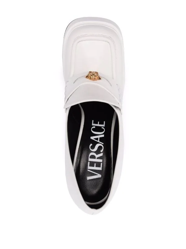 Détail Medusa, bout carré, semelle intérieure à logo, talon haut épais, semelle à plateforme. Couleur : blanc. Matière : cuir.