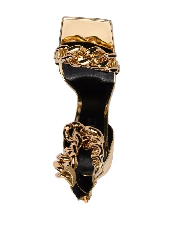 Détails de chaînes, breloque à logo, bride à un doigt, bride cheville, bout carré, bout ouvert, talon haut épais. Couleur : or. Matière : cuir.