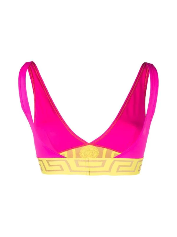 Fuchsia, jaune canari, motif Greca signature imprimé, motif Medusa, construction stretch, bonnets triangles, bande élastiquée.