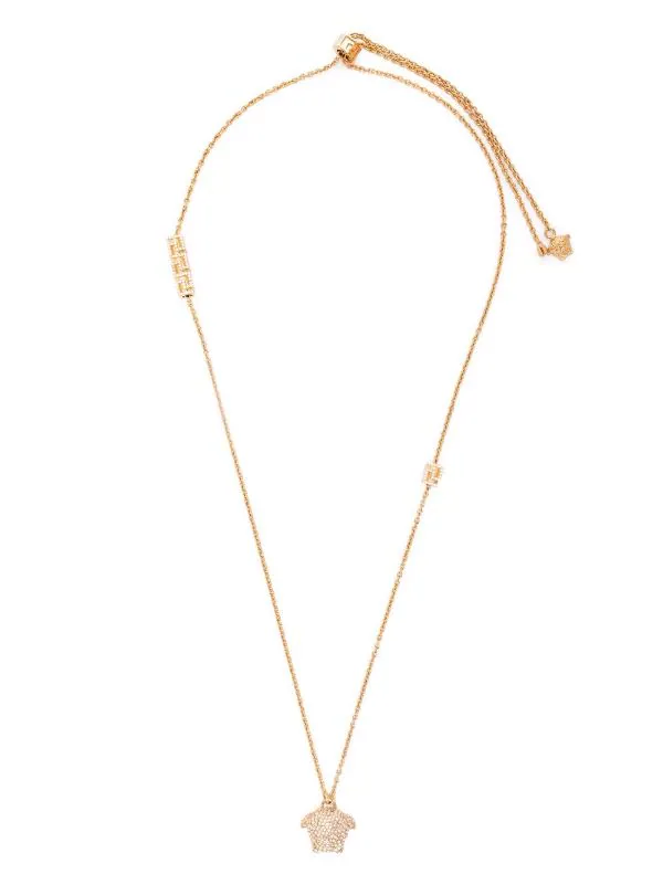 Motif Medusa, ornement en cristal, chaîne fine, finitions en métal doré.