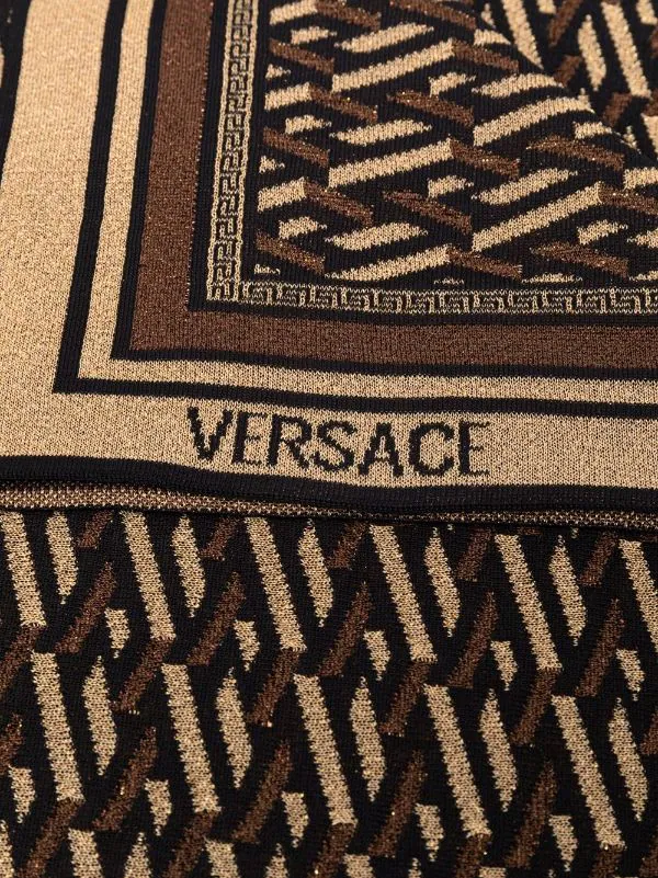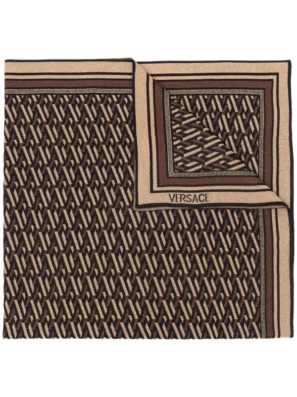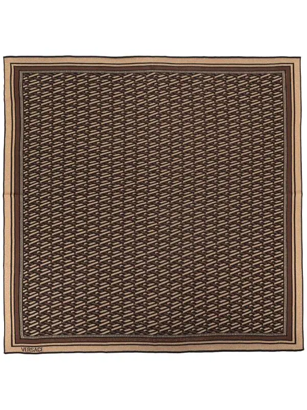 Tissage métallisé, motif monogrammé, bordure rayée, bords finis.