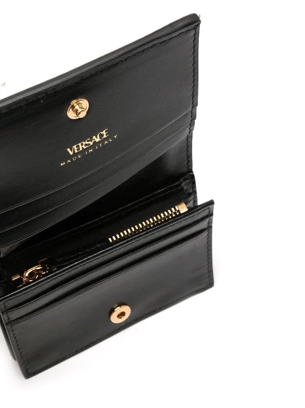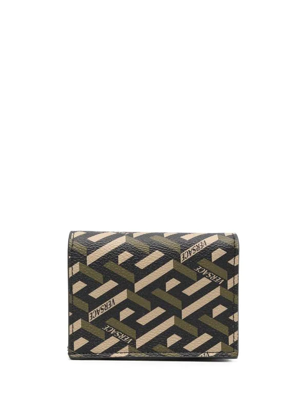 Imprimé La Greca signature, finitions en métal doré, rabat sur le dessus à boutons pression, compartiments intérieurs pour carte, poche ticket. Matière : cuir.