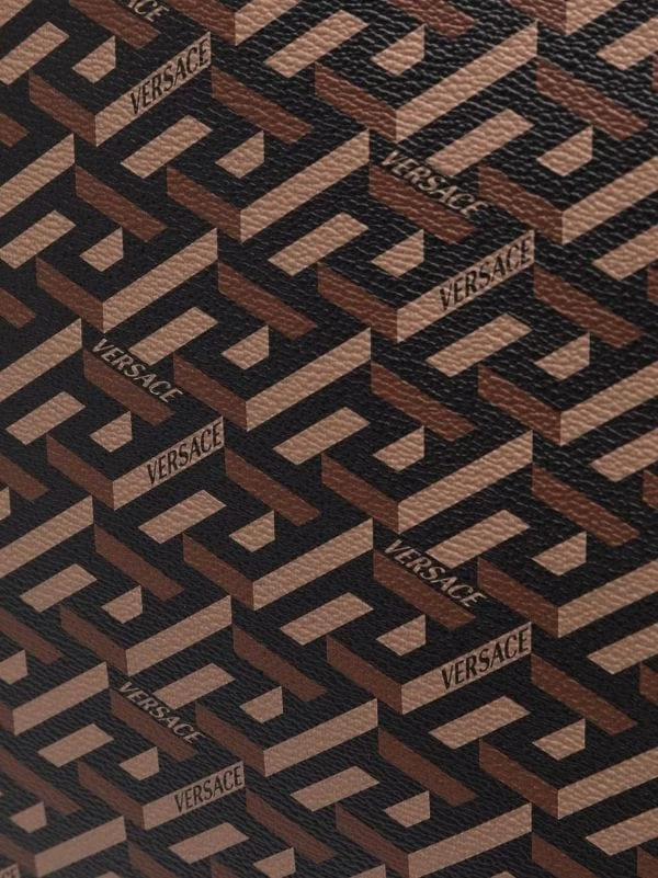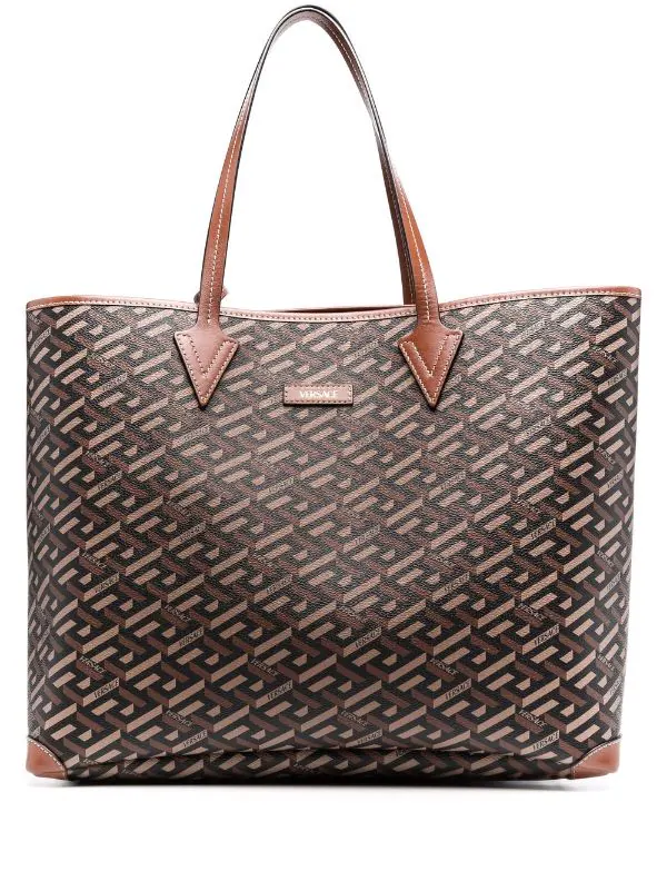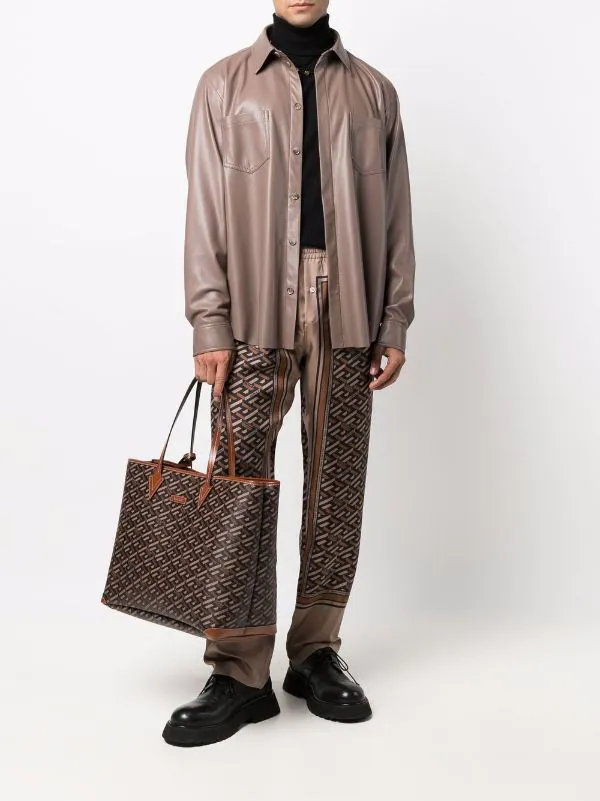 Coutures contrastantes, imprimé géométrique, imprimé monogrammé, anses sur le dessus, patch logo sur le devant, ouverture sur le dessus, compartiment principal. Matière : cuir de veau.