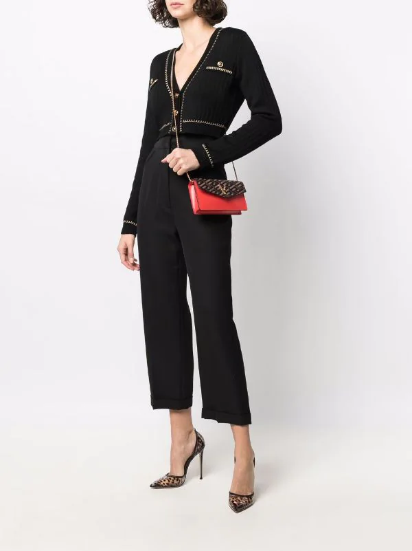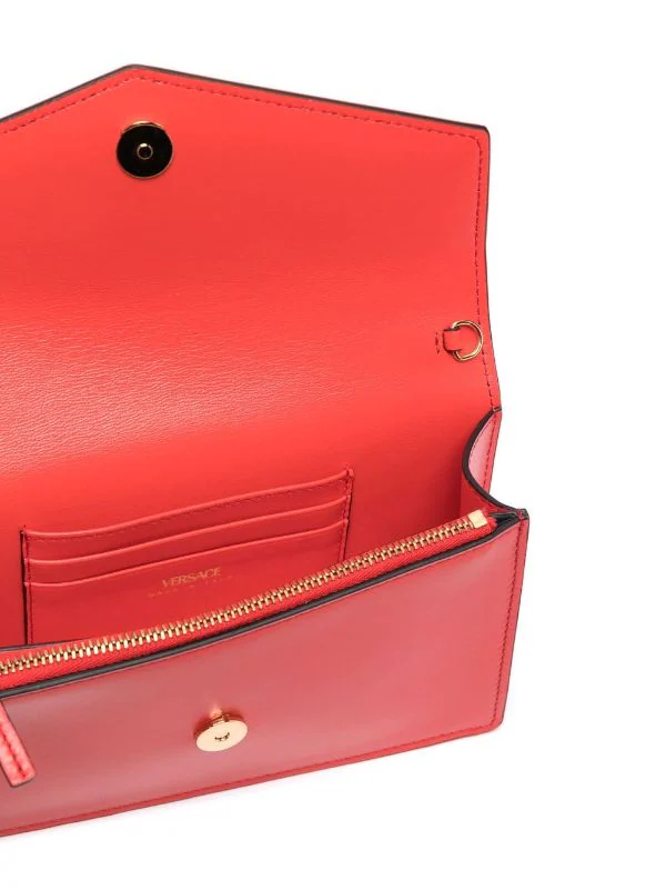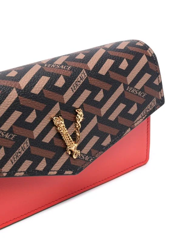 Détail de logo Virtus signature, motif Greca signature imprimé, style enveloppe, bride porté épaule en chaîne détachable, rabat sur le dessus à fermeture magnétique, compartiment principal, compartiments intérieurs pour carte, poche intérieure zippée.