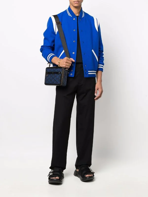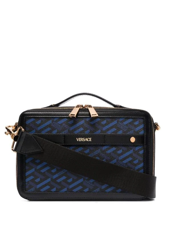 Motif Greca signature imprimé, logo imprimé sur le devant, liseré en cuir, finitions en métal doré, compartiment principal, fermeture zippée tout autour, anse classique, bride porté épaule détachable. Matière : cuir de veau.