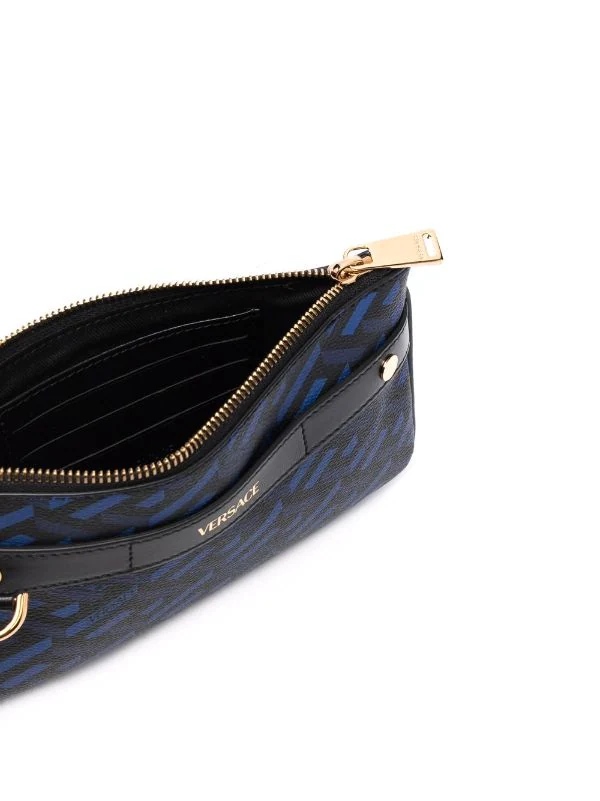 Logo imprimé sur le devant, détail Greca signature, fermeture zippée sur le dessus, compartiments intérieurs pour carte. Matière : toile.