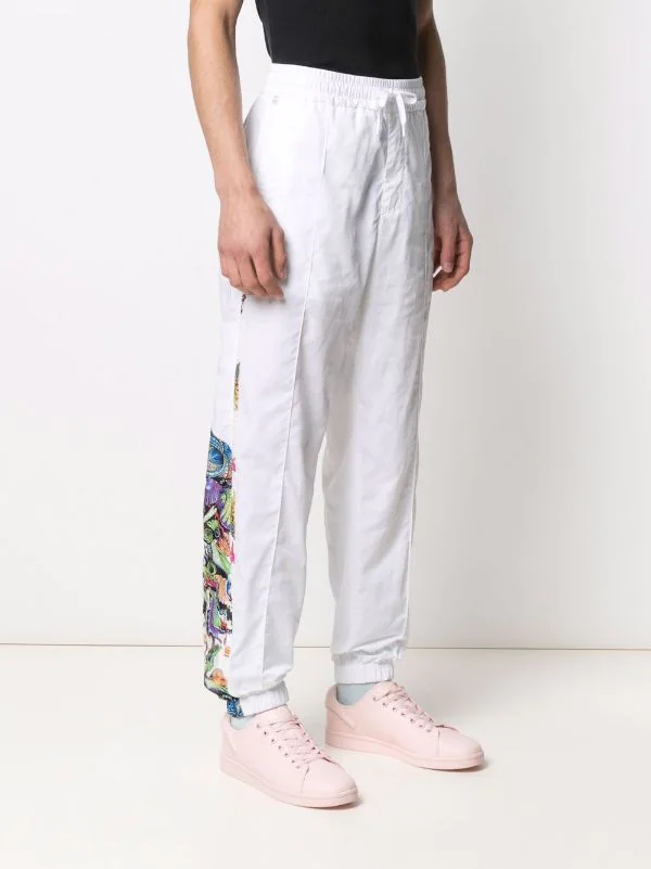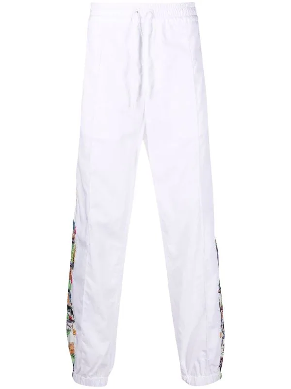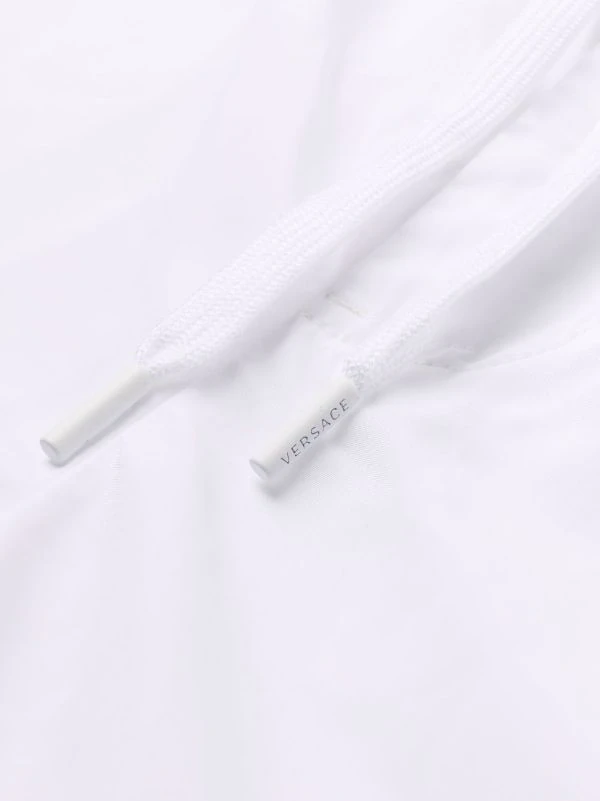 Empiècements contrastants, taille élastique à lien de resserrage, poches latérales fendues, poches arrière passepoilées, poignets élastiqués, hauteur cheville. Couleur : blanc. Matière : coton.