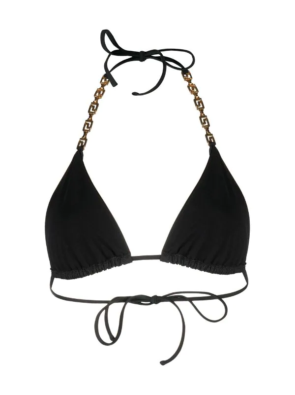 Détail Greca signature, fermeture dos-nu à nouer, bonnets triangles. Couleur : noir.