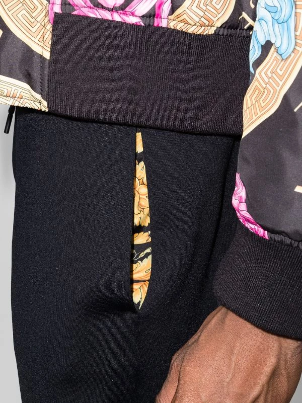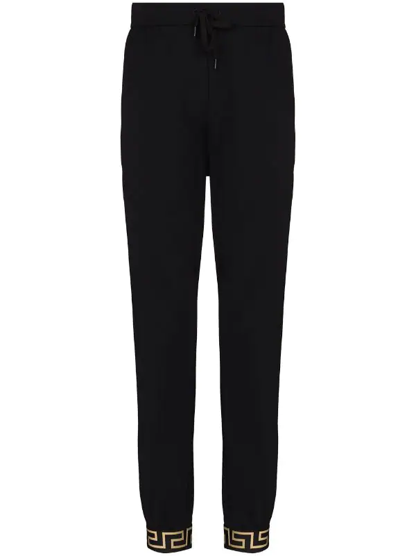 Motif baroque, détail Greca signature, taille élastique à lien de resserrage, poches latérales fendues, chevilles élastiques. Couleur : noir.
