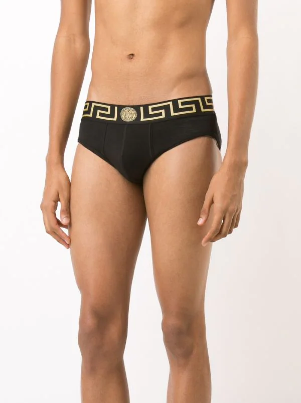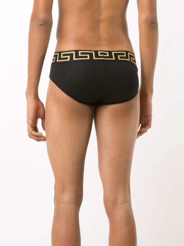Slip Greca en coton stretch noir et métallisé doré Versace avec fermeture élastique. Les sous-vêtements et la lingerie doivent être essayés par dessus vos propres vêtements.