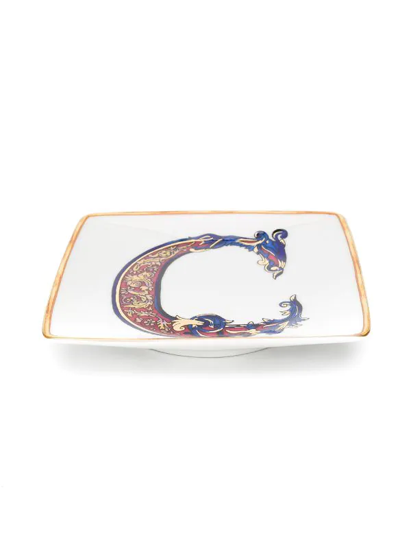 Assiestte Holiday Alphabet ‘C’ Versace Home avec forme carrée, dessus concave et imprimé baroque. Couleur : blanc.