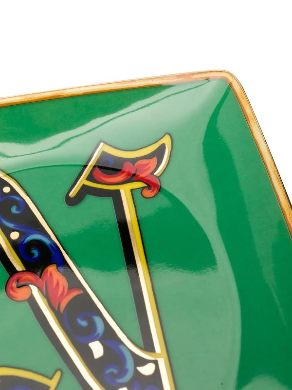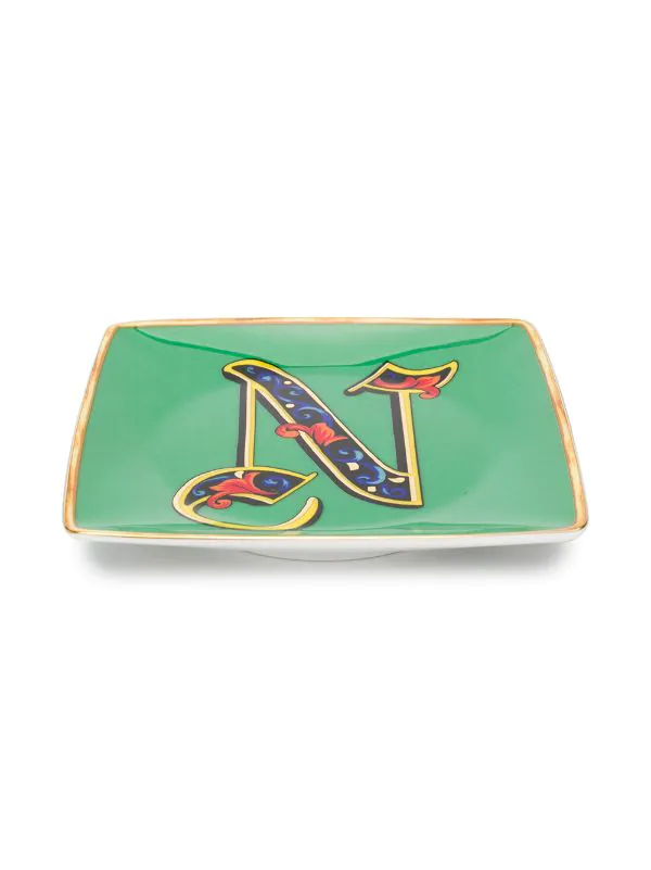 Assiestte Holiday Alphabet ‘N’ Versace Home avec forme carrée, imprimé baroque et dessus concave. Couleur : vert.