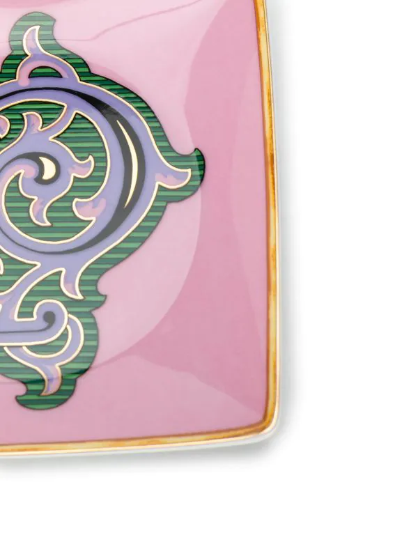 Assiestte Holiday Alphabet ‘P’ en matériaux synthétiques->porcelaine Versace Home avec forme carrée, imprimé baroque et dessus concave. Couleur : rose.