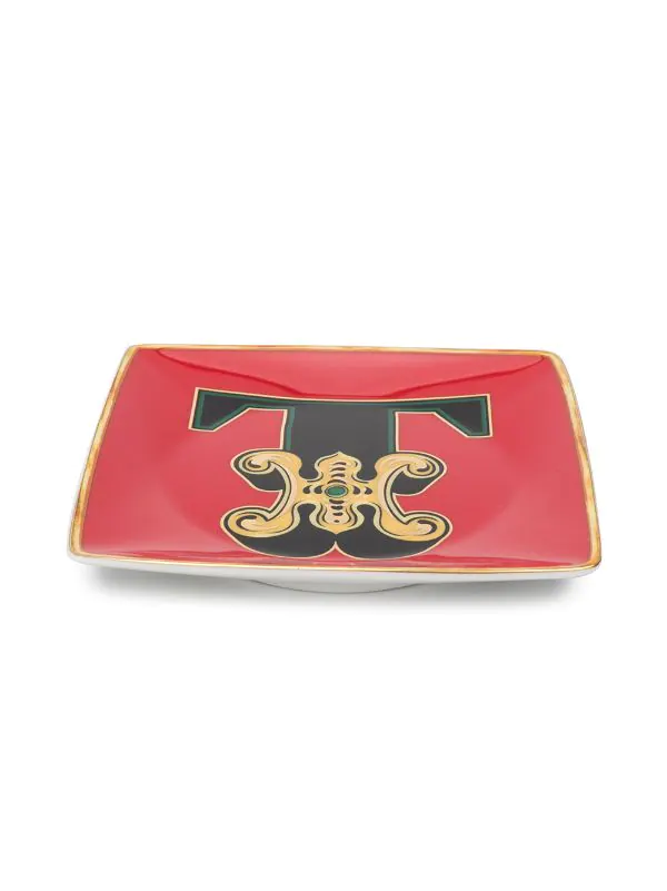 Assiestte Holiday Alphabet ‘T’ Versace Home avec forme carrée, dessus concave et imprimé baroque. Couleur : rouge.