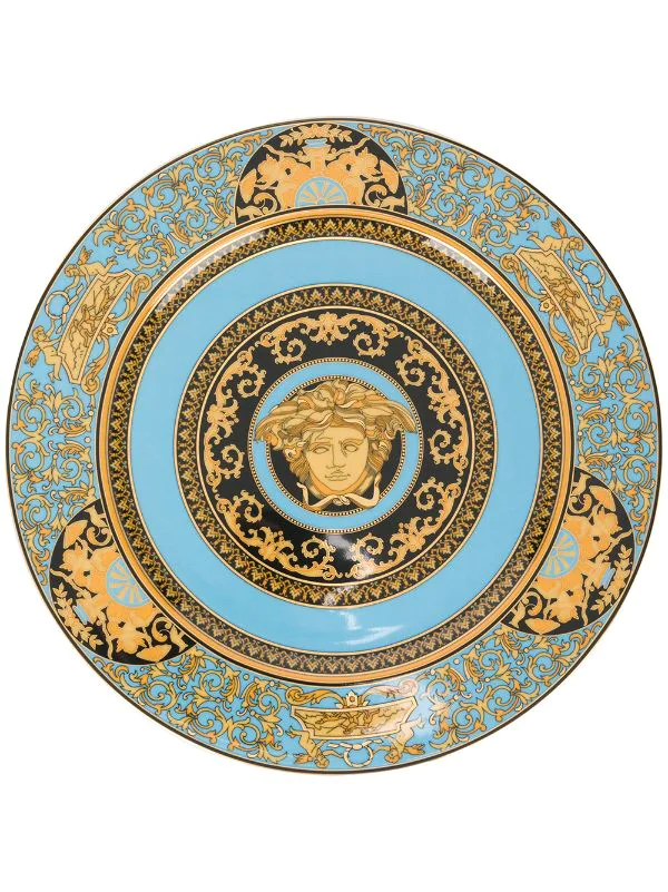 Assiette Medusa à imprimé baroque Versace Home avec imprimé baroque, détail Medusa et structure incurvée.