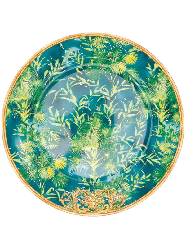 Assiette ronde imprimée Versace Home avec imprimé jungle, détail Medusa et structure incurvée.
