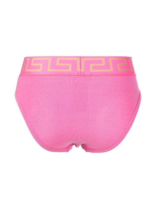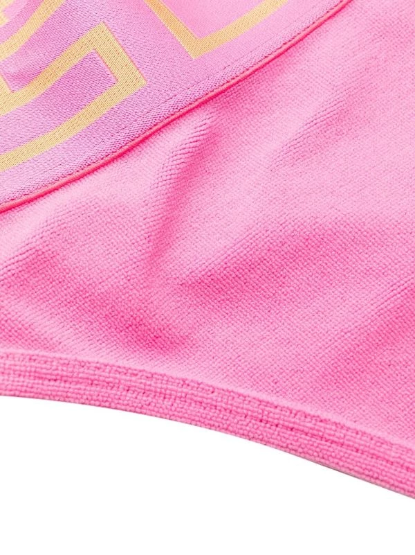 Rose, détail Greca signature, ceinture à logo, construction stretch. Veillez à essayer les maillot de bain par-dessus vos propres sous-vêtements.