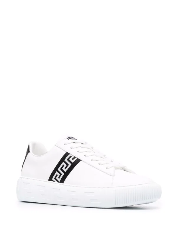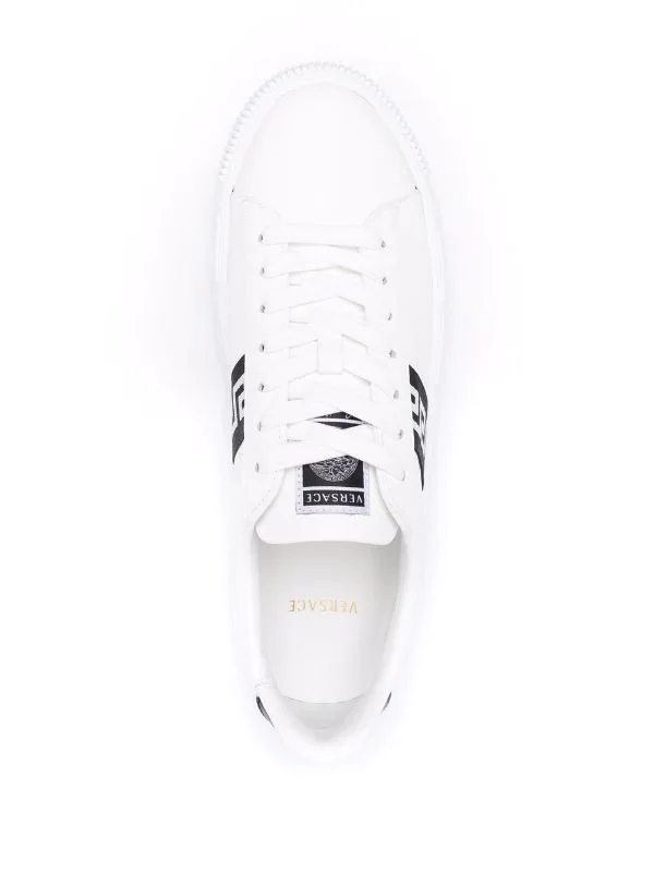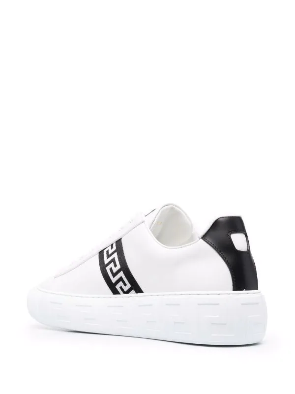 Détail Greca signature, bout rond, fermeture à lacer sur le devant, semelle plate en caoutchouc. Matière : cuir.