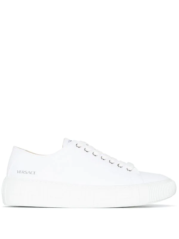 Détail Greca signature, fermeture à lacer sur le devant, bout rond, logo imprimé sur le côté, languette à patch logo, motif Medusa. Couleur : blanc. Matière : cuir.