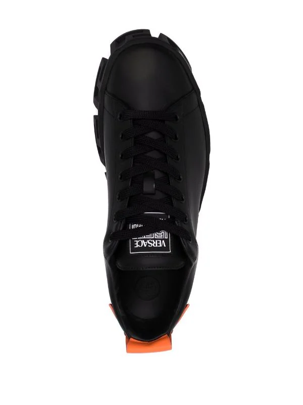 Détail Greca signature, languette à logo imprimé, contrefort contrastant, fermeture à lacer sur le devant, bout rond, semelle crantée en caoutchouc. Matière : cuir.