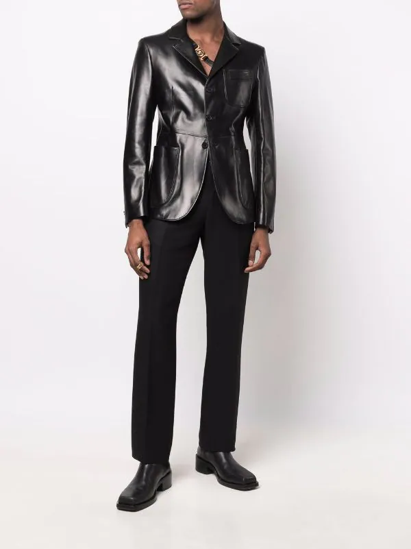 Revers crantés, boutonnière sur le devant, poche poitrine plaquée, poches latérales kangourou, pinces, fente arrière centrale, épaulettes, manches longues, poignets boutonnés. Couleur : noir. Matière : cuir.