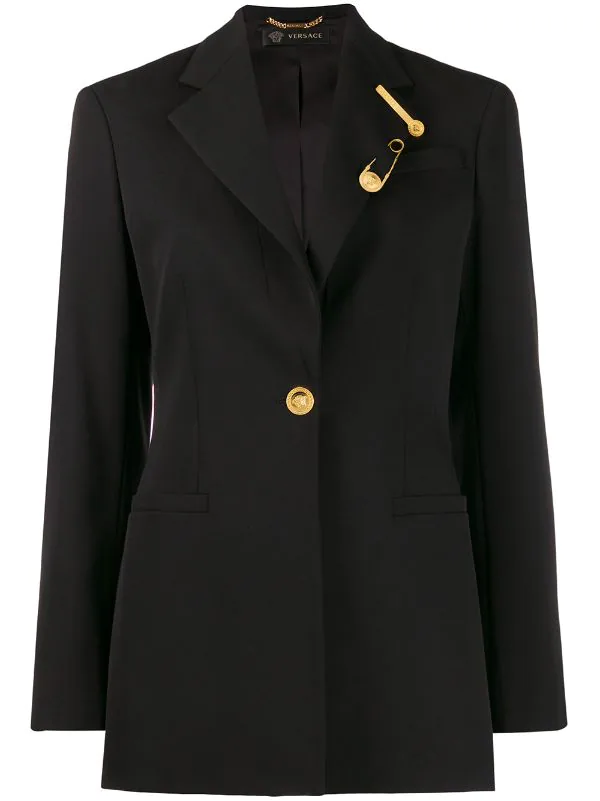 Blazer long classique Versace avec revers crantés, boutonnière sur le devant, manches longues, poches devant et finitions dorées. Couleur : noir.