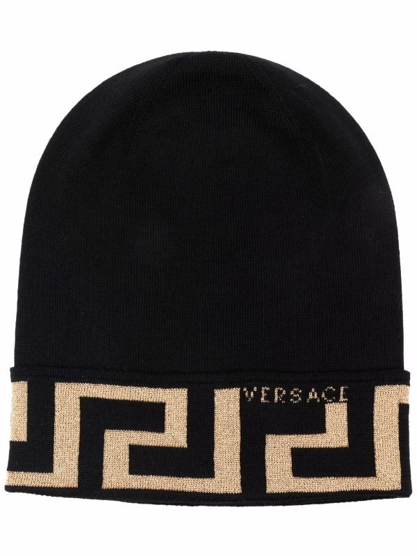 Design tricoté, détail Greca signature, logo intarsia, effet métallisé, ourlet retroussé.