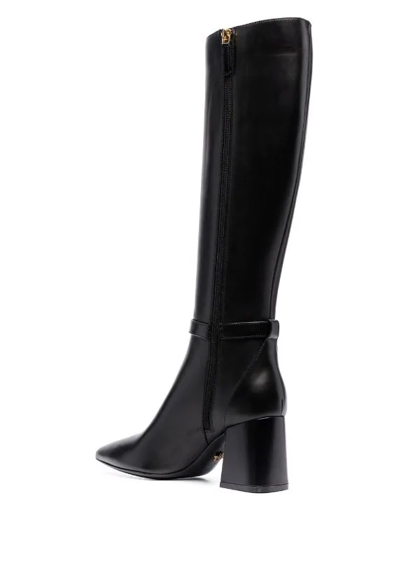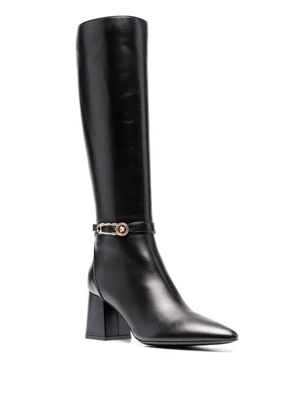 Détail d’épingle Medusa signature, bout pointu, fermeture zippée sur les côtés, hauteur genou, semelle intérieure à logo, talon haut épais, finitions en métal doré. Couleur : noir. Matière : cuir.
