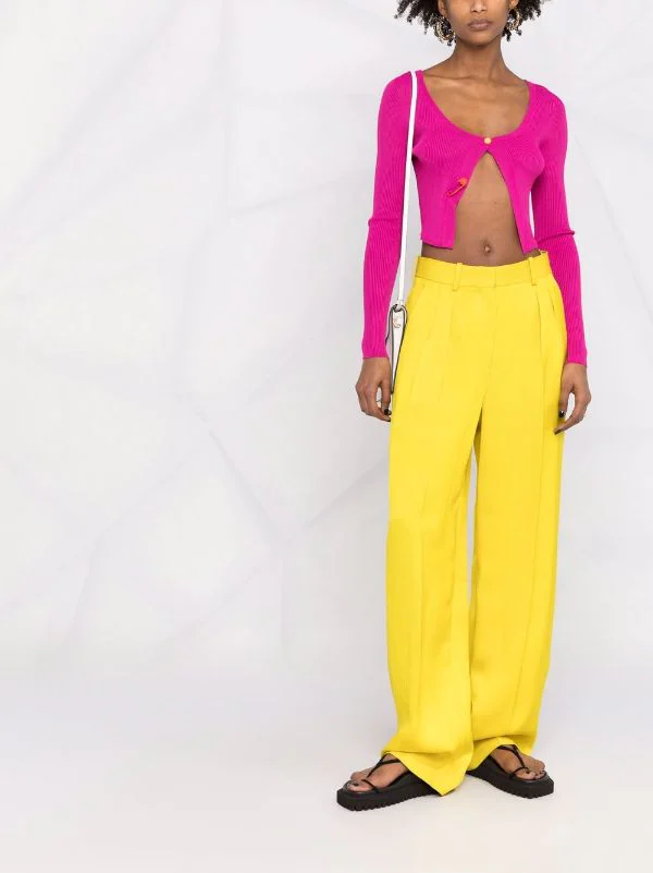 Détail d’épingle Medusa signature, fines nervures, encolure ronde, boutonnière sur le devant, manches longues, devant ouvert, coupe courte. Couleur : rose.