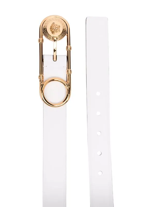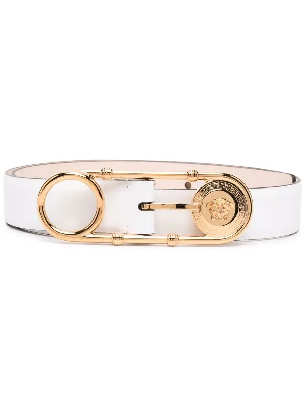 Détail Medusa, fermeture à boucle dorée, taille ajustable. Matière : cuir de veau.