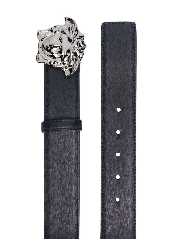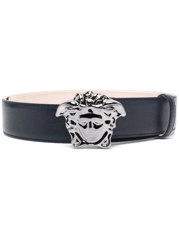 Détail Medusa, finitions en métal argenté, fermeture à boucle, taille ajustable. Couleur : bleu. Matière : cuir.