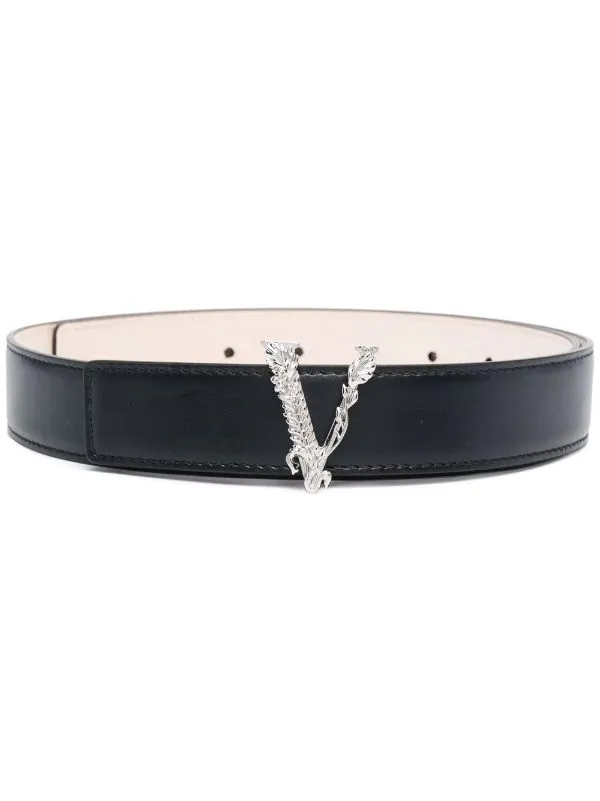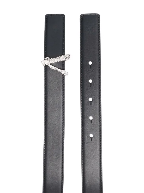Détail de boucle à logo, ornements argentés, taille ajustable. Couleur : noir. Matière : cuir.