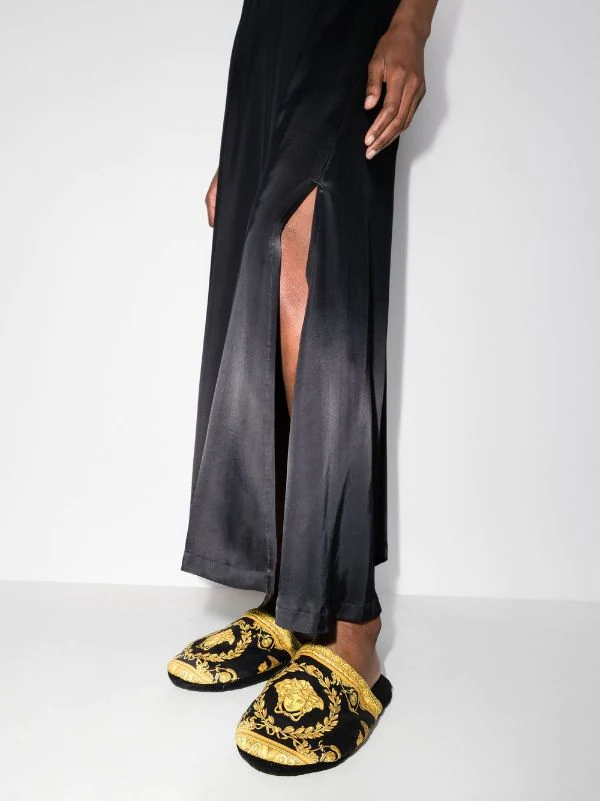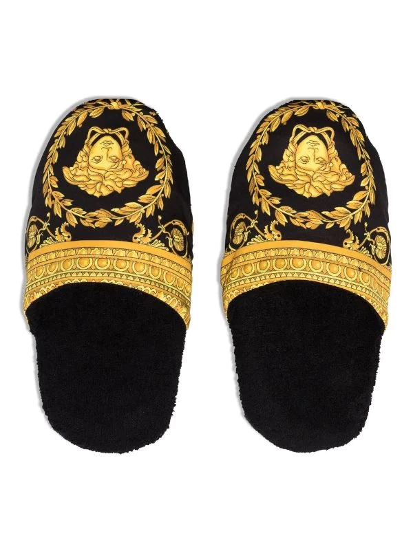 Imprimé Barocco signature, motif Medusa, bout rond, design à enfiler, semelle intérieure à coussinet plantaire, semelle plate. Couleur : noir. Matière : coton.
