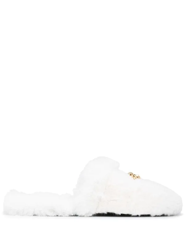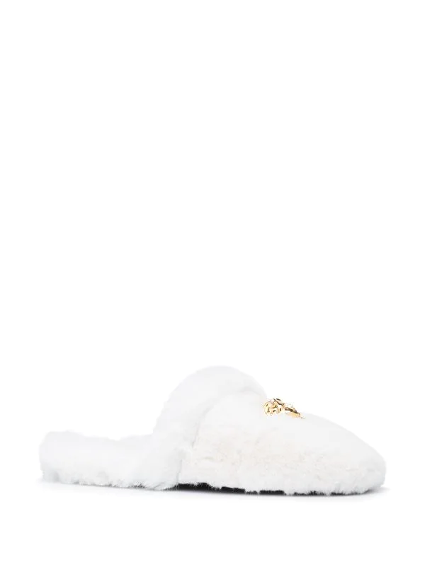 Motif Medusa, finitions en métal doré, finitions en fourrure artificielle, bout rond, design à enfiler, semelle plate. Couleur : blanc.