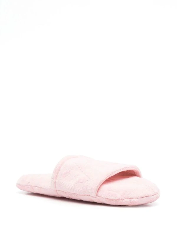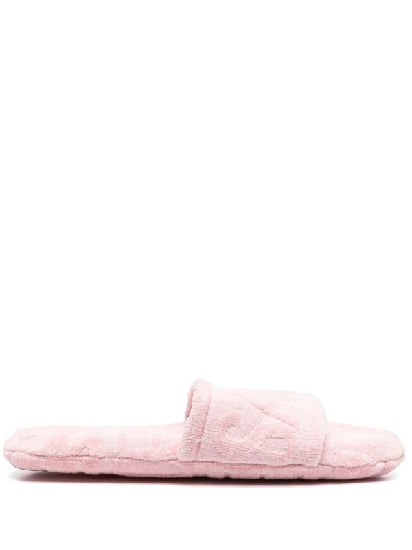 Tissu éponge, imprimé monogrammé, bout rond, semelle plate, design à enfiler. Couleur : rose. Matière : coton.