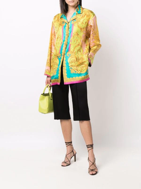 Tissage croisé, imprimé Medusa Renaissance signature, col cranté, manches longues, boutonnière sur le devant. Matière : soie.